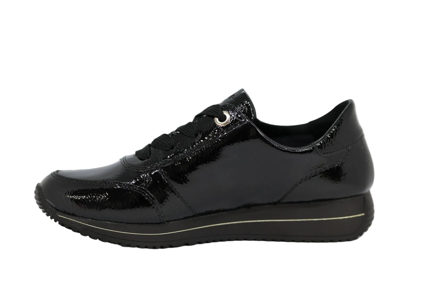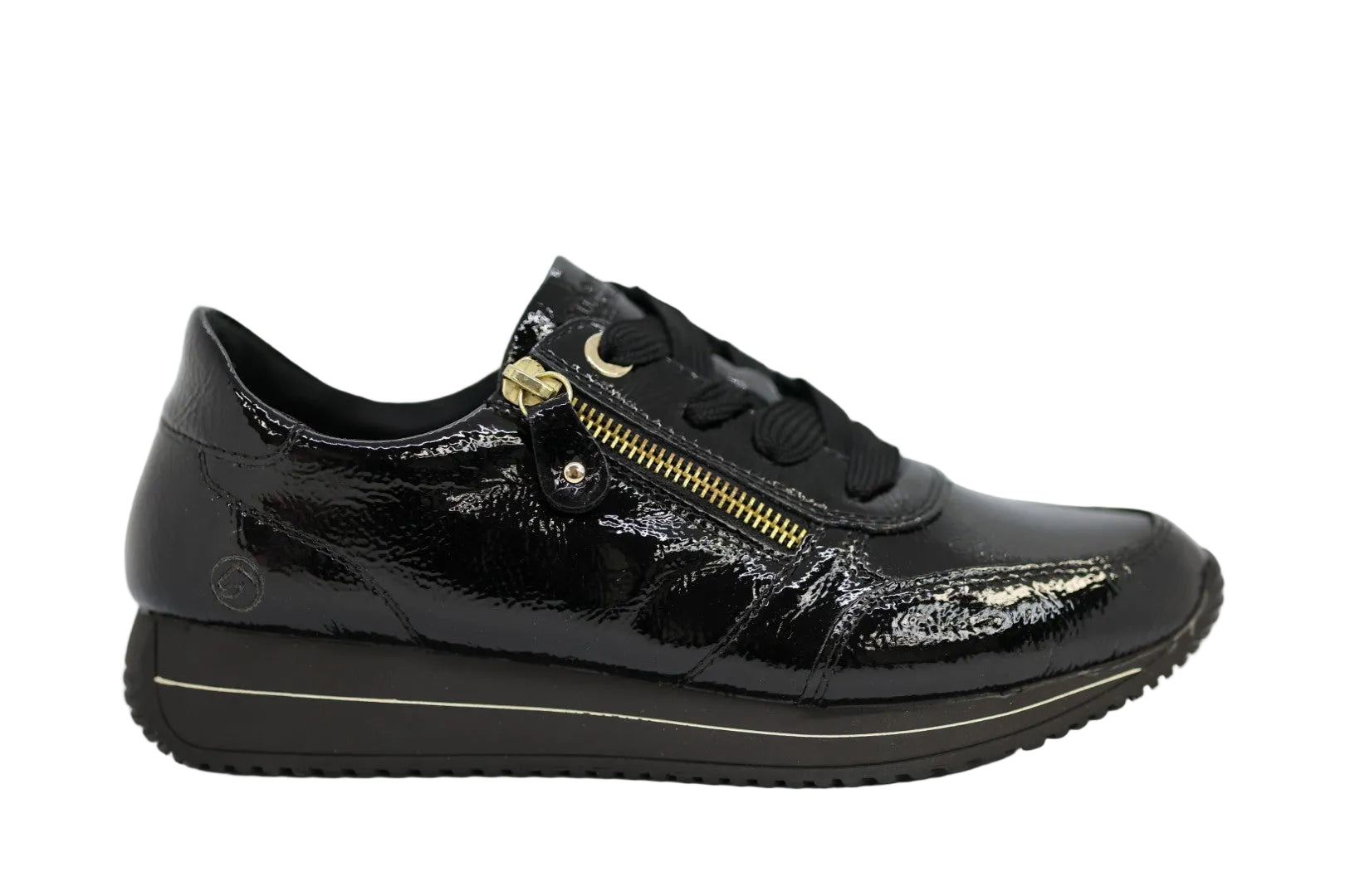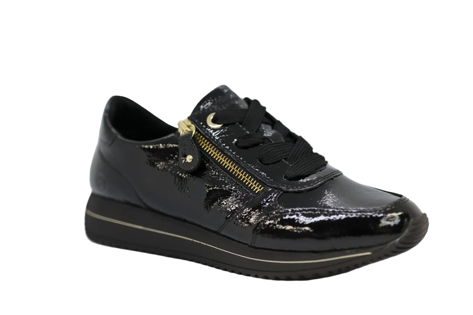 The Remonte black patent leather sneaker offers a sleek, high-shine finish with a stylish gold zip detail for a modern edge. Designed with a lace-up front and convenient side zip, it ensures a secure fit with easy on-and-off access. Perfect for everyday wear, this comfortable women’s shoe combines fashion, support, and all-day versatility.