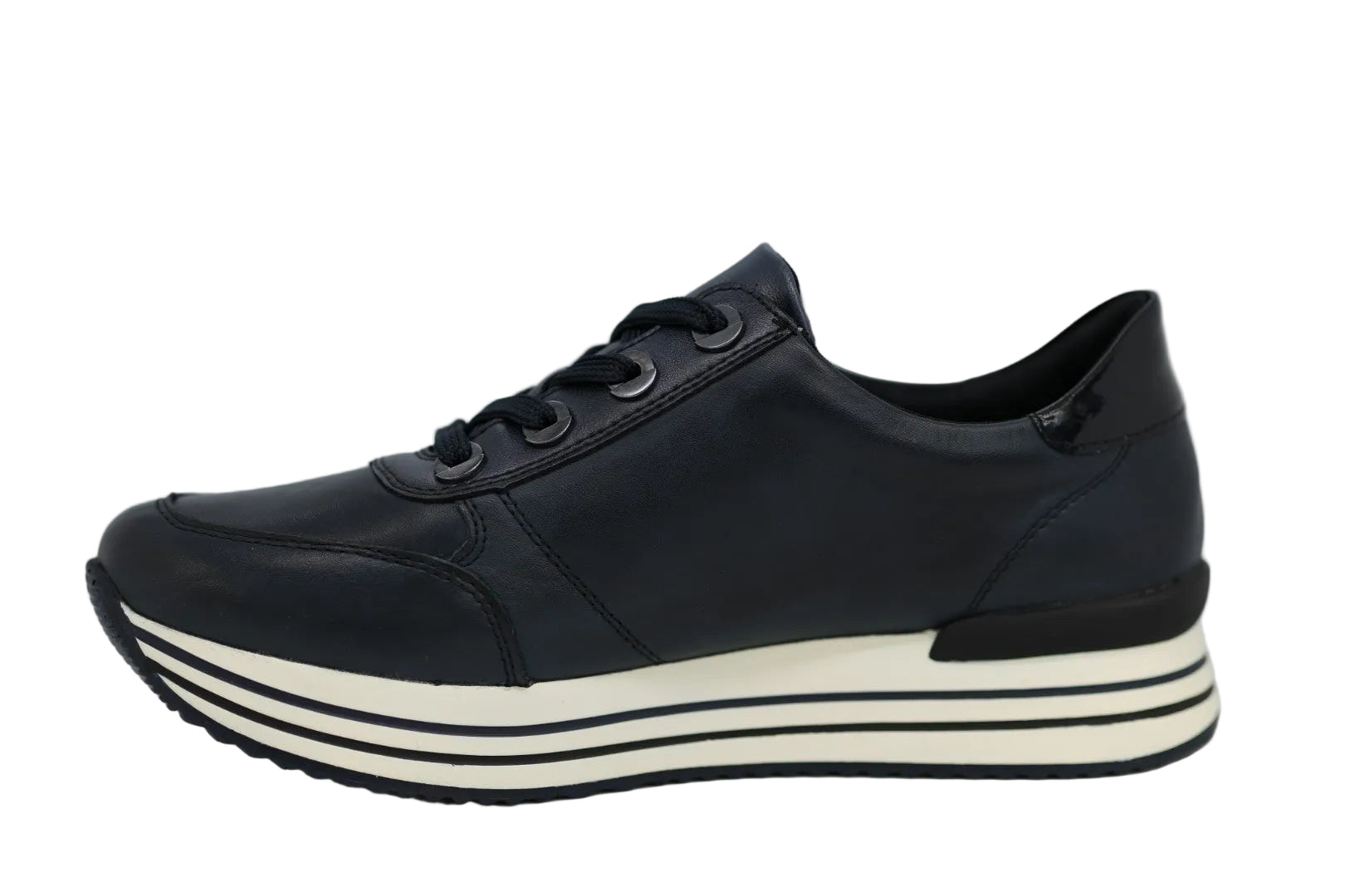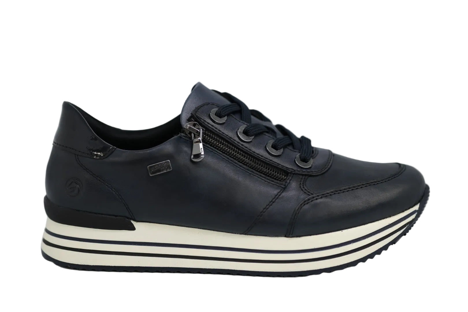 The Remonte D1302 sneaker by Rieker is crafted from premium leather and features a bold thick sole for elevated style and all-day comfort. Designed with a lace-up front and convenient side zip, it offers a secure fit with easy on-and-off access. This standout women’s shoe is the perfect statement piece for autumn, combining modern style with everyday versatility.