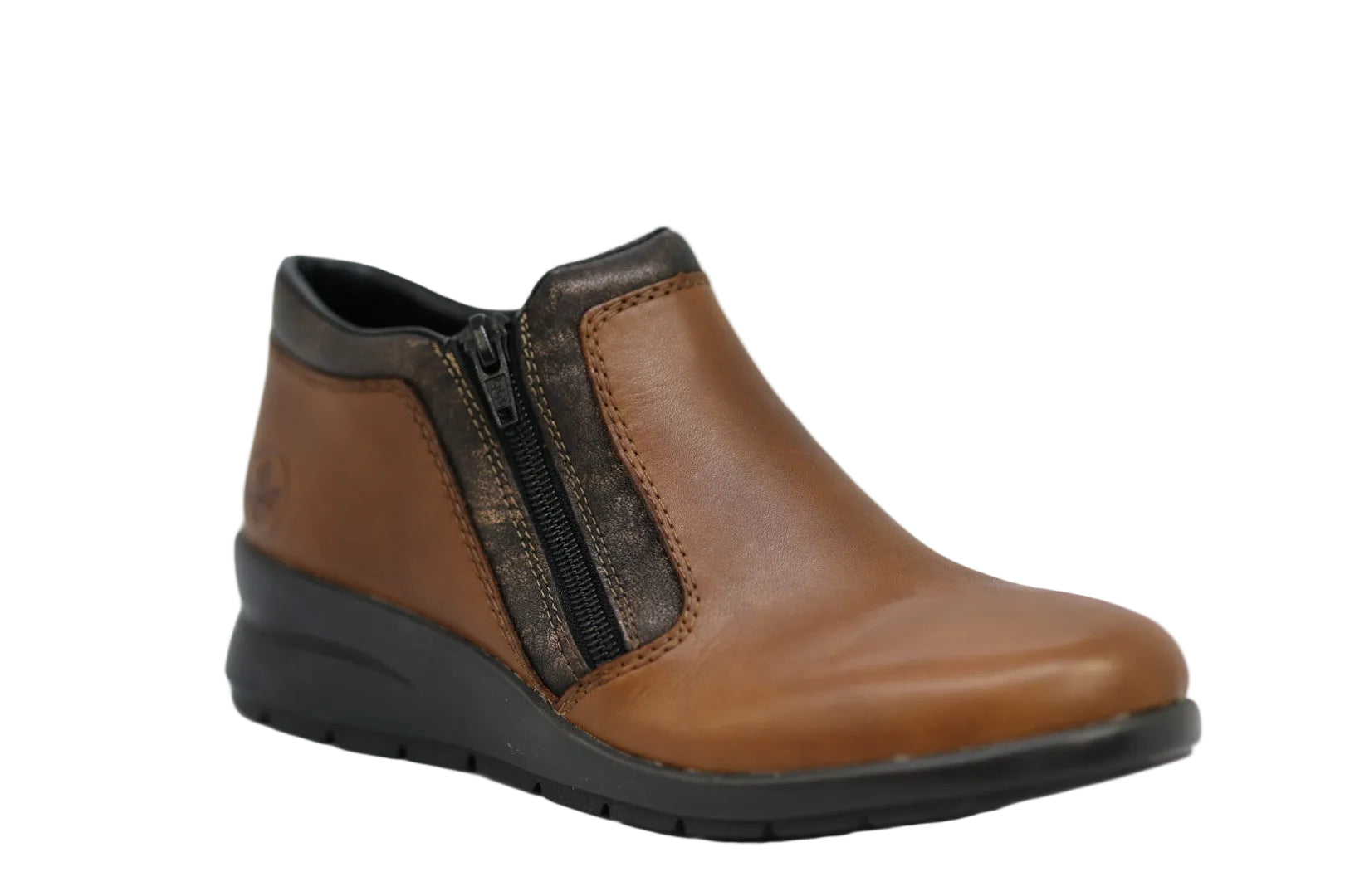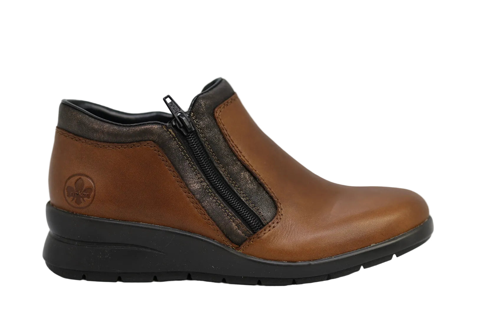 The L4883 ankle boot by Rieker combines timeless style with everyday comfort, crafted from smooth leather for a premium finish. Featuring a supportive wedge heel, lightweight shock-absorbing sole, and removable cushioned insole, it’s designed for all-day wear. Complete with a convenient side zip and Rieker’s Antistress technology, this versatile women’s boot delivers comfort, support, and effortless style.